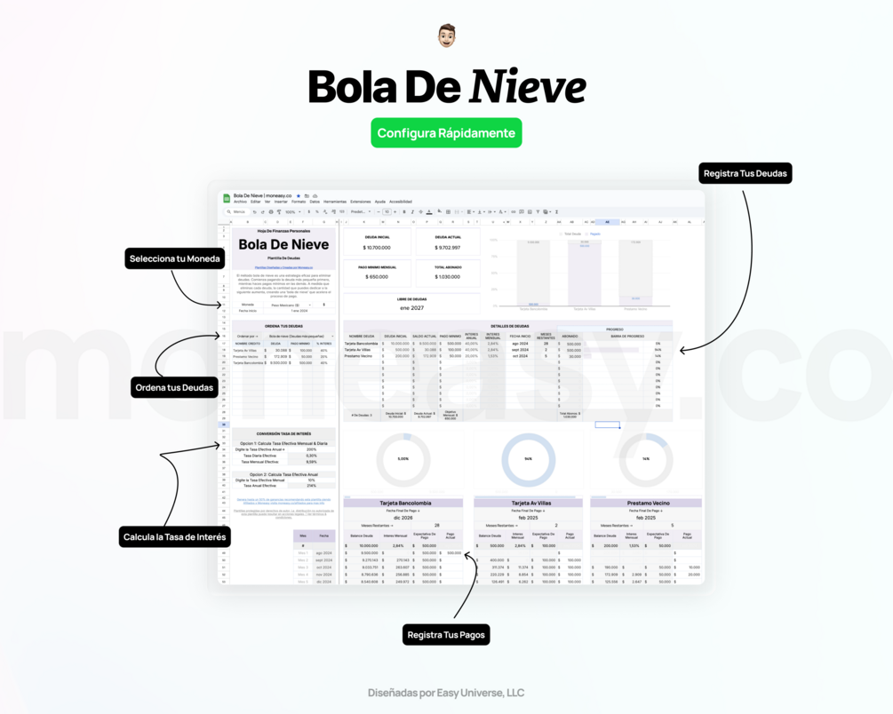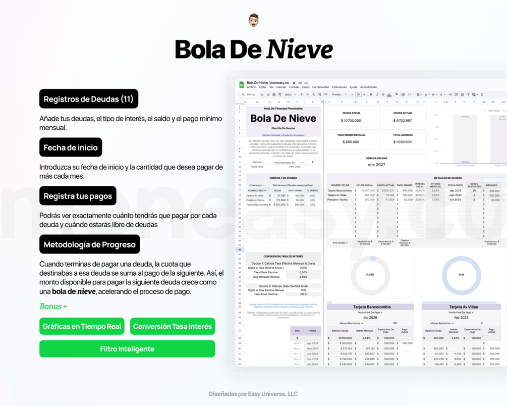 En esta plantilla encontrarás una forma fácil e intuitiva de avanzar, eliminar todas tus deudas y alcanzar tus objetivos y el camino hacia tu libertad financiera.
