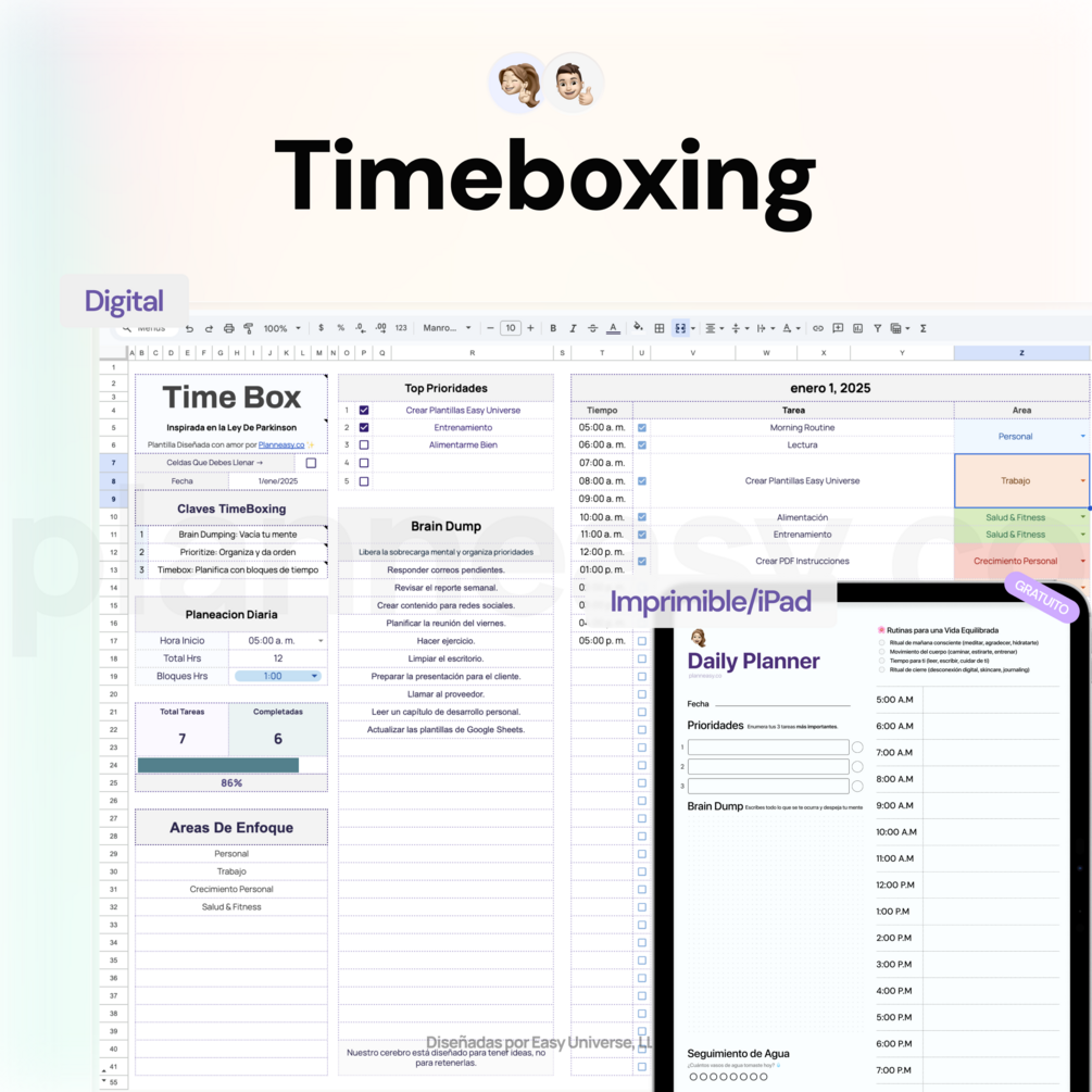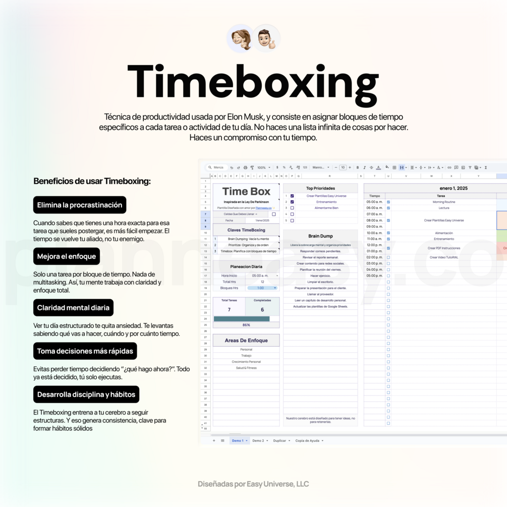 Si te sientes poco productivo y tienes acumulación de trabajo causándote estrés diariamente. La solución está diseñada en esta plantilla, inspirada en la Ley de Parkinson la técnica usada por líderes como Elon Musk.